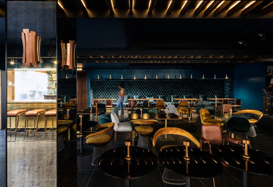 SAX is a jazz restaurant designed to cater for harmonious physical & visual interactions. The dynamics and movement between the musicians and performers on stage and the various corners of the venue were essential. Thus, different seating areas with a particular function were created: a formal dining area stretches down the entire left wall, while an elongated bar takes over the entire facing wall. In the center, low-seating allows customers to enjoy the stage performance more intently, while high tables further back, integrated within the library racks, caters for side conversations. Finally, “love-bird cages”, surrounded with greenery, offer a more cocooned intimacy & sensual experience, while maintaining an unobstructed view of the entire floor.